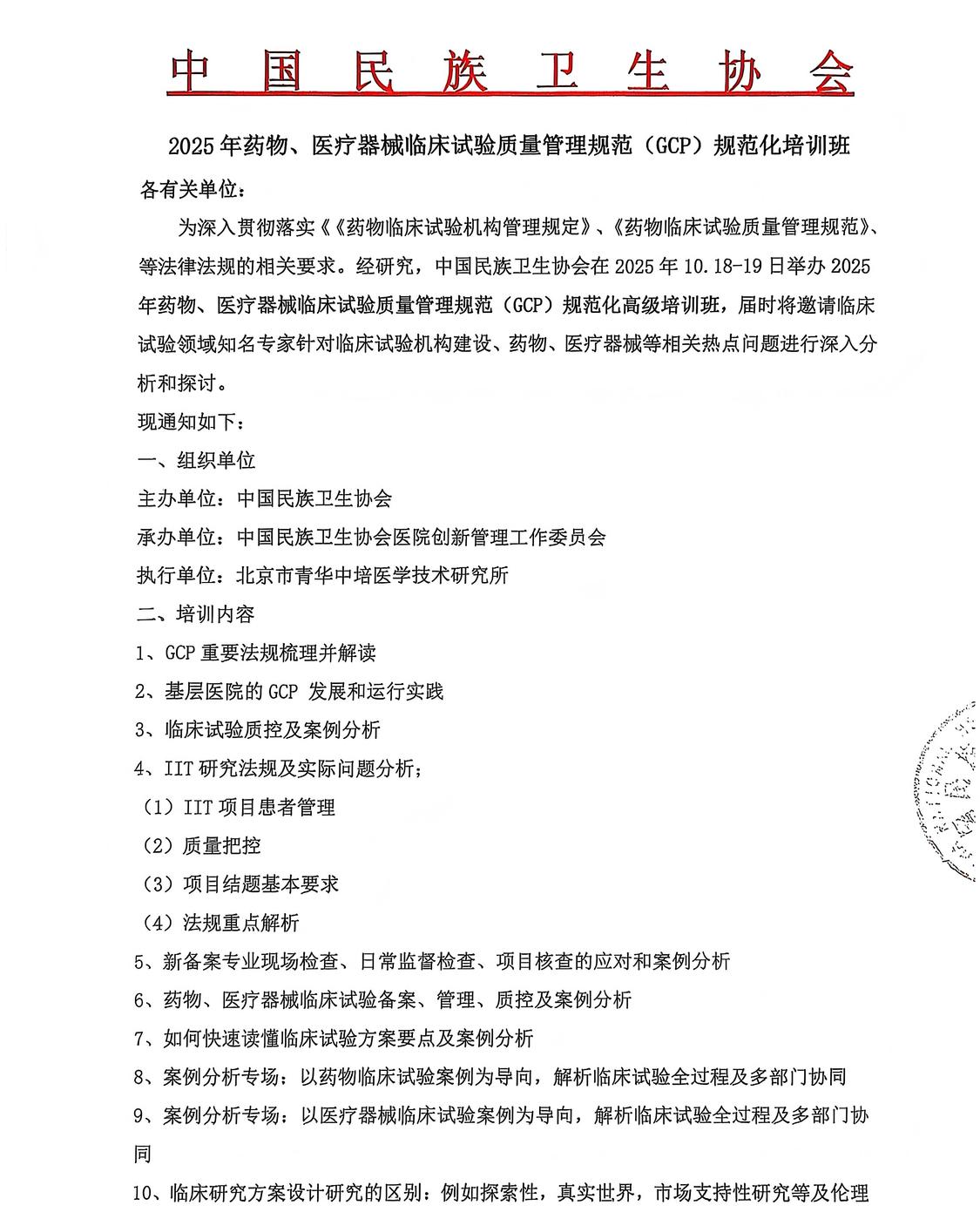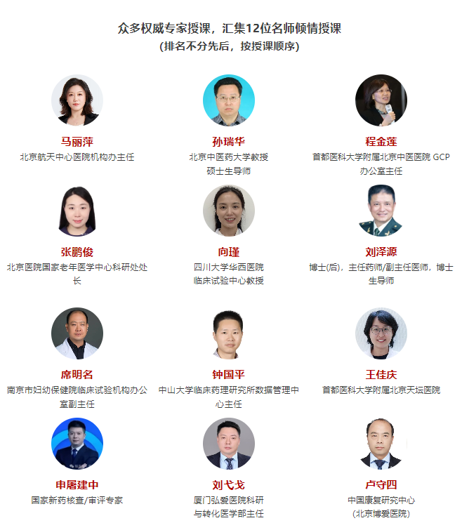 2025年药物、医疗器械临床试验质量管理规范(GCP)规范化培训班 ---2025年10月18日-19日 请各单位接此通知后积极转发并组织相关人员届时参加培训,参加本次学习的学员请将报名回执填写后发到会务负责人贾老师微信(13488887543);具体会议信息通知在会议开始前3天发给报名学员; 培训费(线上):120元/位 备注会议名称:2025年药物、医疗器械临床试验质量管理规范(GCP)规范化培训班 授课为线上进行,参加线上学习的学员需实名认证进入直播间。(青华医学学习平台) 10月18日上午 9:00-10:00--(马丽萍 北京航天中心医院机构办主任 ) ◈GCP重要法规梳理并解读 10:00-11:00--(孙瑞华 北京中医药大学教授硕士生导师) ◈基层医院的GCP 发展和运行实践 11:00-12:00--(程金莲 首都医科大学附属北京中医医院 GCP 办公室主任) ◈临床试验质控及案例分析 10月18日下午 14:00-15:00--(张鹏俊 北京医院国家老年医学中心科研处处长) ◈IIT研究法规及实际问题分析; (1)IIT项目患者管理 (2)质量把控 (3)项目结题基本要求 (4)法规重点解析 15:00-16:00--(向瑾 四川大学华西医院临床试验中心教授) ◈新备案专业现场检查、日常监督检查、项目核查的应对和案例分析 16:00-17:00--(刘泽源 博士(后),主任药师/副主任医师,博士生导师 ) ◈药物、医疗器械临床试验备案、管理、质控及案例分析) 10月19日上午 9:00-10:00--(席明名 南京市妇幼保健院临床试验机构办公室副主任 ) ◈如何快速读懂临床试验方案要点及案例分析 10:00-11:00--(钟国平 中山大学临床药理研究所数据管理中心主任) ◈案例分析专场:以药物临床试验案例为导向,解析临床试验全过程及多部门协同 11:00-12:00--(王佳庆 首都医科大学附属北京天坛医院) ◈案例分析专场:以医疗器械临床试验案例为导向,解析临床试验全过程及多部门协同 10月19日下午 14:00-15:00--(申屠建中 国家新药核查/审评专家) ◈临床研究方案设计研究的区别:例如探索性,真实世界,市场支持性研究等及伦理审查方面的区别 15:00-16:00--(刘弋戈 厦门弘爱医院科研与转化医学部主任 ) ◈研究型护士在临床试验中的关键作用及案例分析 16:00-17:00--(卢守四 中国康复研究中心(北京博爱医院) 主任药师、科研处处长) ◈ICHE6(R3)生效后对临床试验实施的影响: (1)如何提高临床试验效率 (2)文件记录受控的最佳实践有哪些 (3)机构层面提高临床试验效率的方法有哪些? 马丽萍 临床医学、药理学专业;毕业于北京大学医学部,美国UNMC访问学者;现任北京大学首钢医院临床研究机构办公室主任/I期试验中心负责人;主要从事临床试验机构管理和研究工作,完成300余项I-IV期注册类临床试验的管理、方案设计和研究工作,积累了一定的临床研究经验 学术兼职: 中国医药质量管理协会临床研究质量与评价专业委员会委员;中国药理学会治疗药物监测研究专业委员会委员;中国医疗器械行业协会医学数据分析专业委员会常务委员;中国老年保健协会药物临床研究与评价专业委员会委员;北京药理学会药物代谢专业委员会委员;北京肿瘤学会临床研究专委员委员;北京市卫健委处方点评专家;临床试验检查员等; 孙瑞华 研究员,原中日友好医院临床研究数据与项目管理平台副主任。北京中医药大学教授,硕士生导师。中国医药质量管理协会副秘书长、临床研究质量与评价专业委员会副主委兼秘书长;世界中医药学会联合会常务理事、临床科研统计学会会长;北京医学会临床流行病学和循证医学分会常务委员等。NMPA审核查验中心检查员、临床研究数据核查专家;NMPA药品审评中心统计学审评专家;NMPA医疗器械审评中心统计学审评专家;“中医药研究伦理审查体系认证(CAP认证)”审核员等。 程金莲 主任医师,首都医科大学附属北京中医医院 GCP 办公室主任、HRPP 办公室主任,负责医院药物器械临床试验管理及医院HRPP 体系建设和认证。国家药监局临床试验现场核查专家、会审专家,国家中药品种保护审评专家,世中联中医药研究伦理审查体系认证(CAP 认证)审核员,中华中医药协会标准化委员会评审专家,科技部评审专家。中国食品药品企业质量安全促进会临床研究管理专委会第一届委员会副主任委员,中关村玖泰药物临床试验技术创新联盟伦理审查研究评价专业委员会第一届副主任委员,中国药学会第一届药物临床试验伦理学研究专业委员会委员,北京医学伦理学会医学伦理审查分会副主任委员、秘书长,中华中医药学会中药临床药理分会常务委员,世中联临床疗效评价专委会常务理事。牵头发布团体标准 3 项。 张鹏俊 副北京医院 国家老年医学中心 科研处处长 中国医学科学院北京协和医学院 博士生导师 国家卫生健康委老年健康标准专业委员会 委员兼秘书长 中国医学科学院老年医学研究院 理事 北京慢性病防治与健康教育研究会科研管理专业委员会 主任委员 中国老年保健协会科研分会 副主任委员 中国标准化协会主动健康专业委员会 常委 北京医学会医学科学研究管理学分会 委员 北京医学会伦理学分会 委员 Aging Medicine 编委,《中华医学科研管理杂志》通讯编委等职 承担国家重点研发课题1项,省部级课题5项;发表论文90余篇 向 瑾 四川大学华西医院临床试验中心教授 四川大学华西乐城医院 教授 四川大学医疗器械监管研究院兼职研究员 中国残疾人康复协会医疗器械临床试验质量管理专业委员会副主任