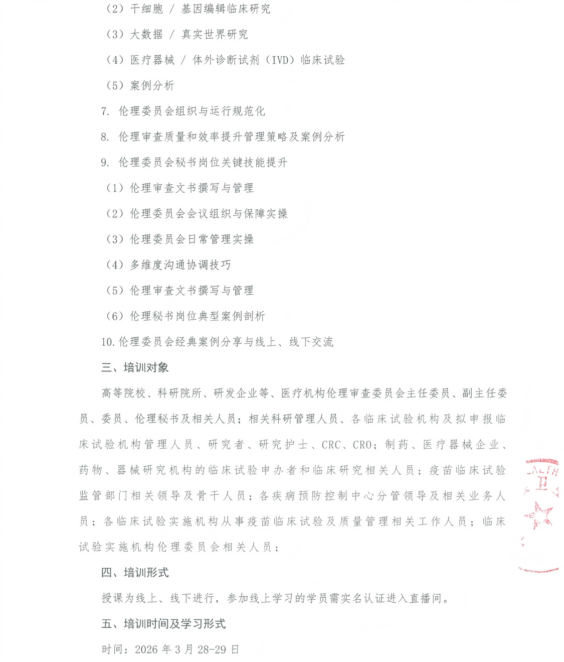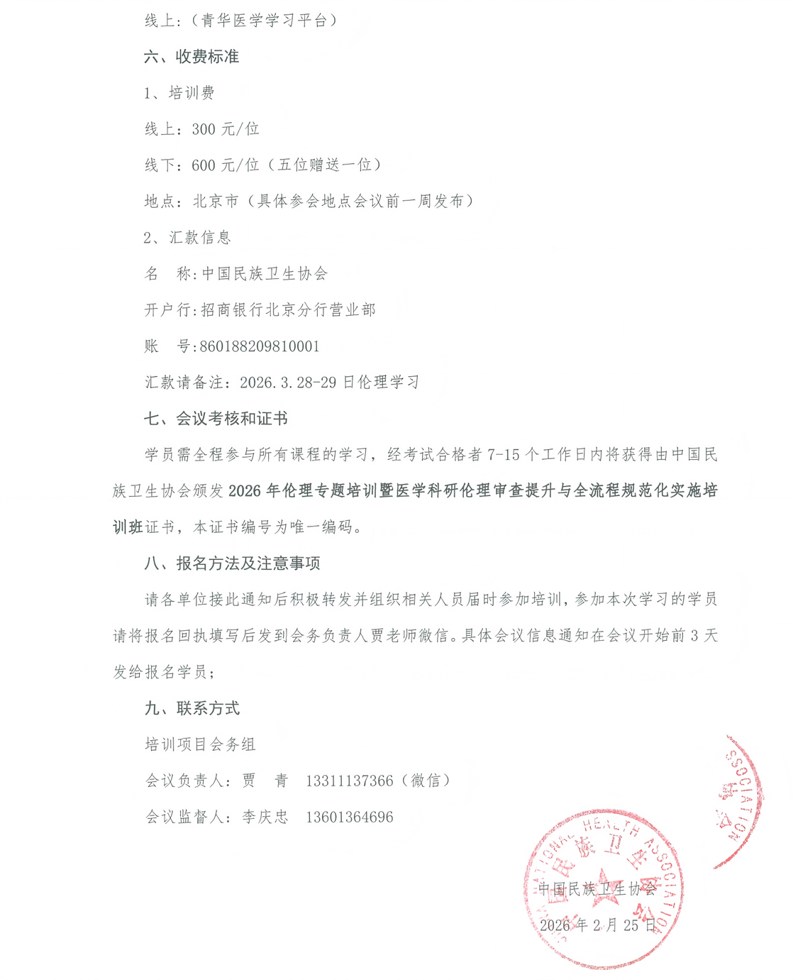 为了提高医疗机构伦理审查及GCP人员的能力提升,可根据机构实际情况做针对性培训,线上、线下均可,具体可咨询会议负责人李老师13601364696。 2026年伦理专题培训暨医学科研伦理审查提升与全流程规范化实施培训班 ---2026年3月28日-29日 备注:电子证书会议结束后2天即可下载查询 请各单位接此通知后积极转发并组织相关人员届时参加培训,参加本次学习的学员请将报名回执填写后发到会务负责人李老师微信(13601364696);具体会议信息通知在会议开始前3天发给报名学员; 线上:300元/位 线下:600元/位(五位赠送一位) 地点:北京市(具体参会地点会议前一周发布) 备注会议名称:2026年伦理专题培训暨医学科研伦理审查提升与全流程规范化实施培训班 授课为线上、线下同步进行,参加线上学习的学员需实名认证进入直播间。(青华医学学习平台)线下地点:北京市(具体参会地点会议前一周发布) 3月28日上午 9:00-10:00--(翟晓梅 中国医学科学院北京协和医学院特聘教授) ◈2026年最新伦理相关政策深度解析 10:00-12:00--(张海洪 北京大学生物医学伦理委员会副主任委员) ◈跟踪审查、复审、结题审查与风险管控案例分析 ◈最新 GCP法规对伦理审查的影响与应对 3月28日下午 14:00-15:00--(李义庭 首都医科大学原党委副书记) ◈伦理核心原则与审查逻辑实操及案例分析 15:00-18:00--(陆麒 上海交通大学医学院附属仁济医院伦理委员会办公室主任) ◈伦理委员会秘书岗位关键技能提升 (1)伦理审查文书撰写与管理 (2)伦理委员会会议组织与保障实操 (3)伦理委员会日常管理实操 (4)多维度沟通协调技巧 (5)伦理审查文书撰写与管理 (6)伦理秘书岗位典型案例剖析 ◈伦理委员会经典案例分享与线上、线下交流 3月29日上午 9:00-12:00--(盛艾娟 首都医科大学附属北京佑安医院) ◈伦理委员会组织与运行规范化 ◈伦理审查质量和效率提升管理策略及案例分析 ◈伦理审查SOP体系构建与优化及案例分析 3月29日下午 14:00-16:00--(张迪 首都医科大学附属北京胸科医院) ◈前沿医学技术伦理审查要点及案例分析 (1)人工智能(AI)辅助诊断/治疗研究 (2)干细胞/基因编辑临床研究 (3)大数据/真实世界研究 (4)医疗器械/体外诊断试剂(IVD)临床试验 (5)案例分析 翟晓梅 中国医学科学院学术咨询委员会学部委员、国家科技伦理委员会委员、国家卫健委医学伦理专家委员会副主任、国家教育部科技伦理委员会委员,中国科协自然辩证法研究会生命伦理学专业委员会理事长,中华预防医学会公共卫生伦理学专业委员会主任委员。WHO全球基因编辑伦理专家委员会、国际干细胞学会委员。她是美国海斯廷研究中心当选Fellow。《Health Care Science》杂志副主编、《Asian Bioethics Review》杂志编委,《自然辩证法研究》编委。担任国际国内一些学术刊物的编委和审稿人。出版有学术著作、译作和主编著作,发表中英文学术论文多篇,拥有重要的学术影响。 张海洪 伦理学博士,北京大学生物医学伦理委员会副主任委员。美国杜克大学、密西根大学访问学者。2014年至今,专职从事受试者保护、科技伦理审查与科研诚信研究及相关教育培训工作。2015年至2025年,负责北京大学科研诚信与科研伦理培训平台建设。参与世界医学会《赫尔辛基宣言》(2024)、《国际医学伦理准则》(2022)等文件修订工作。主要研究兴趣包括科技伦理审查、科技伦理治理等。 李义庭 国家科技伦理委员会医学伦理分会委员,科技部人类资源管理专家组专家,国家干细胞专家组专家;教育部第八届科技伦理专委会委员;国家卫健委医学伦理专家委员会专家,中华医学会医学伦理学分会第六届委员会主任委员,北京医学伦理学会前任理事长;北京市卫健委医学伦理专家委员会主任委员;校伦理委员会主任委员;中国生命关怀协会常务理事 原副秘书长,中国医师协会道德建设委员会委员;国家科技部、国家卫健委、教育部、国家社科基金、中华医学会等单位项目评审专家,公开出版专著与主编副主编著作23部,论文100多篇。 陆麒 担任世界中医药学联合会伦理审查委员会理事,中国医药教育协会临床试验分会常务理事,上海市医学会医学研究伦理专科分会青年委员,上海市医学伦理学会副秘书长,上海市医学伦理专家委员会聘任秘书,国家药监局NMPA伦理培训讲师,美国西部伦理委员会访问学者、美国匹兹堡大学访问学者、澳大利亚新南威尔士大学访问学者,作为第一负责人参与局级课题6项,发表论文10余篇参编专著3本,2015年首届上海市医学伦理学会“ 医学伦理青年人才奖”。 盛艾娟 主要研究方向: 伦理审查、伦理管理、伦理评审等伦理相关工作;临床研究方案设计及统计分析相关工作。北京佑安医院AAHRPP认证团队核心人员。 社会兼职: 北京市区域伦理审查委员会 办公室主任、中国人体健康科技促进会医学伦理专业委员会首任主任委员、北京医学会医学理论研究与教育分会副主任委员、北京慢性病防治与健康教育研究会医学伦理专业委员会副主任委员、北京医学伦理学会传染病防控伦理研究分会副主任委员、北京医学伦理学会医学伦理审查分会副秘书长、北京医学伦理学会常务理事、北京慢性病防治与健康教育研究会科研管理专业委员会常务委员等。 张迪 工作单位:首都医科大学附属北京胸科医院,北京市结核病胸部肿瘤研究所 专业技术职称:管理硕士,助理研