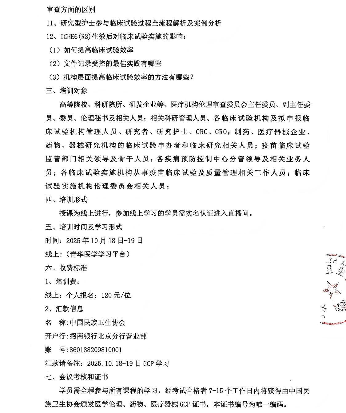 2025年药物、医疗器械临床试验质量管理规范(GCP)规范化培训班 ---2025年10月18日-19日 请各单位接此通知后积极转发并组织相关人员届时参加培训,参加本次学习的学员请将报名回执填写后发到会务负责人贾老师微信(13488887543);具体会议信息通知在会议开始前3天发给报名学员; 培训费(线上):120元/位 备注会议名称:2025年药物、医疗器械临床试验质量管理规范(GCP)规范化培训班 授课为线上进行,参加线上学习的学员需实名认证进入直播间。(青华医学学习平台) 10月18日上午 9:00-10:00--(马丽萍 北京航天中心医院机构办主任 ) ◈GCP重要法规梳理并解读 10:00-11:00--(孙瑞华 北京中医药大学教授硕士生导师) ◈基层医院的GCP 发展和运行实践 11:00-12:00--(程金莲 首都医科大学附属北京中医医院 GCP 办公室主任) ◈临床试验质控及案例分析 10月18日下午 14:00-15:00--(张鹏俊 北京医院国家老年医学中心科研处处长) ◈IIT研究法规及实际问题分析; (1)IIT项目患者管理 (2)质量把控 (3)项目结题基本要求 (4)法规重点解析 15:00-16:00--(向瑾 四川大学华西医院临床试验中心教授) ◈新备案专业现场检查、日常监督检查、项目核查的应对和案例分析 16:00-17:00--(刘泽源 博士(后),主任药师/副主任医师,博士生导师 ) ◈药物、医疗器械临床试验备案、管理、质控及案例分析) 10月19日上午 9:00-10:00--(席明名 南京市妇幼保健院临床试验机构办公室副主任 ) ◈如何快速读懂临床试验方案要点及案例分析 10:00-11:00--(钟国平 中山大学临床药理研究所数据管理中心主任) ◈案例分析专场:以药物临床试验案例为导向,解析临床试验全过程及多部门协同 11:00-12:00--(王佳庆 首都医科大学附属北京天坛医院) ◈案例分析专场:以医疗器械临床试验案例为导向,解析临床试验全过程及多部门协同 10月19日下午 14:00-15:00--(申屠建中 国家新药核查/审评专家) ◈临床研究方案设计研究的区别:例如探索性,真实世界,市场支持性研究等及伦理审查方面的区别 15:00-16:00--(刘弋戈 厦门弘爱医院科研与转化医学部主任 ) ◈研究型护士在临床试验中的关键作用及案例分析 16:00-17:00--(卢守四 中国康复研究中心(北京博爱医院) 主任药师、科研处处长) ◈ICHE6(R3)生效后对临床试验实施的影响: (1)如何提高临床试验效率 (2)文件记录受控的最佳实践有哪些 (3)机构层面提高临床试验效率的方法有哪些? 马丽萍 临床医学、药理学专业;毕业于北京大学医学部,美国UNMC访问学者;现任北京大学首钢医院临床研究机构办公室主任/I期试验中心负责人;主要从事临床试验机构管理和研究工作,完成300余项I-IV期注册类临床试验的管理、方案设计和研究工作,积累了一定的临床研究经验 学术兼职: 中国医药质量管理协会临床研究质量与评价专业委员会委员;中国药理学会治疗药物监测研究专业委员会委员;中国医疗器械行业协会医学数据分析专业委员会常务委员;中国老年保健协会药物临床研究与评价专业委员会委员;北京药理学会药物代谢专业委员会委员;北京肿瘤学会临床研究专委员委员;北京市卫健委处方点评专家;临床试验检查员等; 孙瑞华 研究员,原中日友好医院临床研究数据与项目管理平台副主任。北京中医药大学教授,硕士生导师。中国医药质量管理协会副秘书长、临床研究质量与评价专业委员会副主委兼秘书长;世界中医药学会联合会常务理事、临床科研统计学会会长;北京医学会临床流行病学和循证医学分会常务委员等。NMPA审核查验中心检查员、临床研究数据核查专家;NMPA药品审评中心统计学审评专家;NMPA医疗器械审评中心统计学审评专家;“中医药研究伦理审查体系认证(CAP认证)”审核员等。 程金莲 主任医师,首都医科大学附属北京中医医院 GCP 办公室主任、HRPP 办公室主任,负责医院药物器械临床试验管理及医院HRPP 体系建设和认证。国家药监局临床试验现场核查专家、会审专家,国家中药品种保护审评专家,世中联中医药研究伦理审查体系认证(CAP 认证)审核员,中华中医药协会标准化委员会评审专家,科技部评审专家。中国食品药品企业质量安全促进会临床研究管理专委会第一届委员会副主任委员,中关村玖泰药物临床试验技术创新联盟伦理审查研究评价专业委员会第一届副主任委员,中国药学会第一届药物临床试验伦理学研究专业委员会委员,北京医学伦理学会医学伦理审查分会副主任委员、秘书长,中华中医药学会中药临床药理分会常务委员,世中联临床疗效评价专委会常务理事。牵头发布团体标准 3 项。 张鹏俊 副北京医院 国家老年医学中心 科研处处长 中国医学科学院北京协和医学院 博士生导师 国家卫生健康委老年健康标准专业委员会 委员兼秘书长 中国医学科学院老年医学研究院 理事 北京慢性病防治与健康教育研究会科研管理专业委员会 主任委员 中国老年保健协会科研分会 副主任委员 中国标准化协会主动健康专业委员会 常委 北京医学会医学科学研究管理学分会 委员 北京医学会伦理学分会 委员 Aging Medicine 编委,《中华医学科研管理杂志》通讯编委等职 承担国家重点研发课题1项,省部级课题5项;发表论文90余篇 向 瑾 四川大学华西医院临床试验中心教授 四川大学华西乐城医院 教授 四川大学医疗器械监管研究院兼职研究员 中国残疾人康复协会医疗器械临床试验质量管理专业委员会副主任