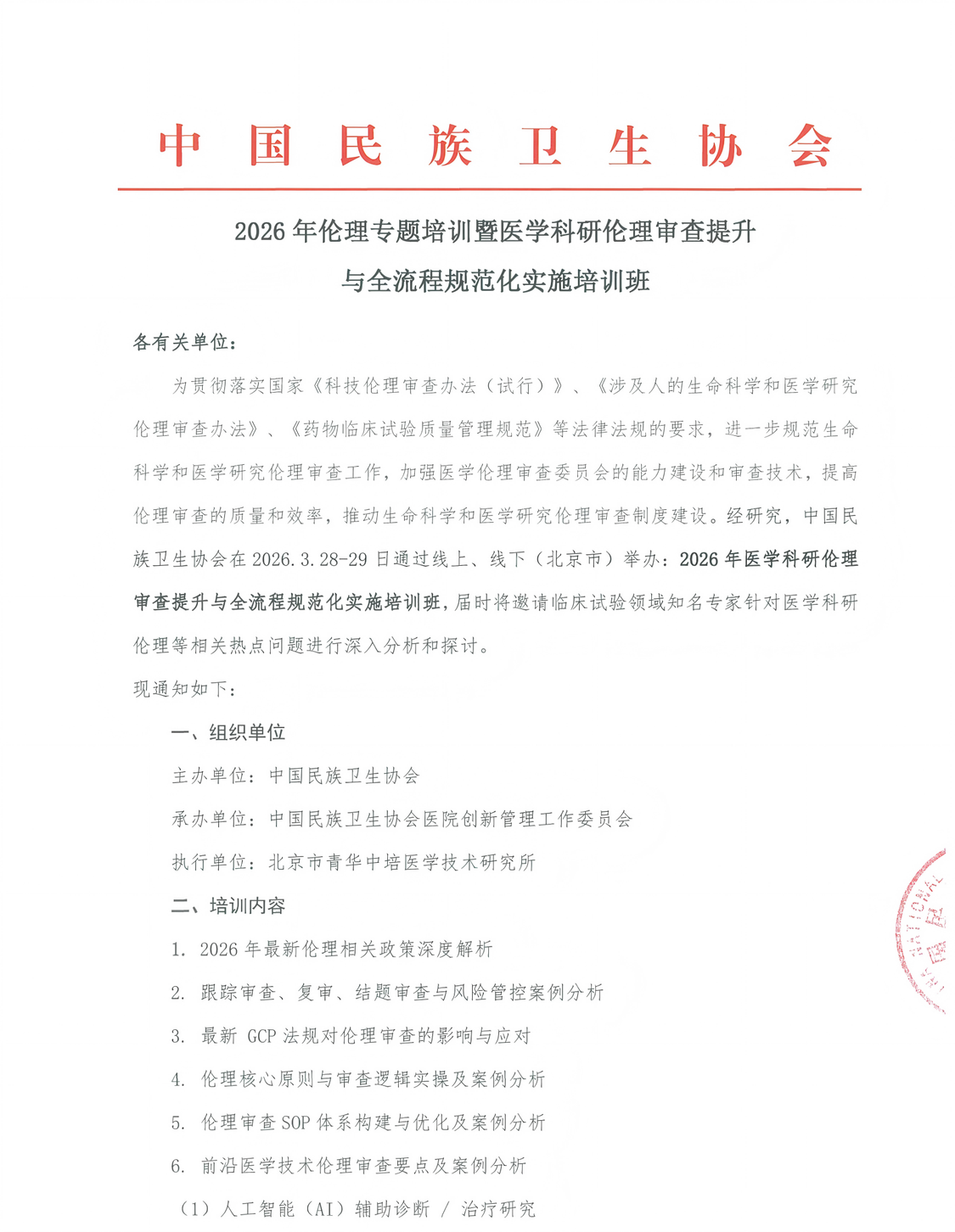 为了提高医疗机构伦理审查及GCP人员的能力提升,可根据机构实际情况做针对性培训,线上、线下均可,具体可咨询会议负责人李老师13601364696。 2026年伦理专题培训暨医学科研伦理审查提升与全流程规范化实施培训班 ---2026年3月28日-29日 备注:电子证书会议结束后2天即可下载查询 请各单位接此通知后积极转发并组织相关人员届时参加培训,参加本次学习的学员请将报名回执填写后发到会务负责人李老师微信(13601364696);具体会议信息通知在会议开始前3天发给报名学员; 线上:300元/位 线下:600元/位(五位赠送一位) 地点:北京市(具体参会地点会议前一周发布) 备注会议名称:2026年伦理专题培训暨医学科研伦理审查提升与全流程规范化实施培训班 授课为线上、线下同步进行,参加线上学习的学员需实名认证进入直播间。(青华医学学习平台)线下地点:北京市(具体参会地点会议前一周发布) 3月28日上午 9:00-10:00--(翟晓梅 中国医学科学院北京协和医学院特聘教授) ◈2026年最新伦理相关政策深度解析 10:00-12:00--(张海洪 北京大学生物医学伦理委员会副主任委员) ◈跟踪审查、复审、结题审查与风险管控案例分析 ◈最新 GCP法规对伦理审查的影响与应对 3月28日下午 14:00-15:00--(李义庭 首都医科大学原党委副书记) ◈伦理核心原则与审查逻辑实操及案例分析 15:00-18:00--(陆麒 上海交通大学医学院附属仁济医院伦理委员会办公室主任) ◈伦理委员会秘书岗位关键技能提升 (1)伦理审查文书撰写与管理 (2)伦理委员会会议组织与保障实操 (3)伦理委员会日常管理实操 (4)多维度沟通协调技巧 (5)伦理审查文书撰写与管理 (6)伦理秘书岗位典型案例剖析 ◈伦理委员会经典案例分享与线上、线下交流 3月29日上午 9:00-12:00--(盛艾娟 首都医科大学附属北京佑安医院) ◈伦理委员会组织与运行规范化 ◈伦理审查质量和效率提升管理策略及案例分析 ◈伦理审查SOP体系构建与优化及案例分析 3月29日下午 14:00-16:00--(张迪 首都医科大学附属北京胸科医院) ◈前沿医学技术伦理审查要点及案例分析 (1)人工智能(AI)辅助诊断/治疗研究 (2)干细胞/基因编辑临床研究 (3)大数据/真实世界研究 (4)医疗器械/体外诊断试剂(IVD)临床试验 (5)案例分析 翟晓梅 中国医学科学院学术咨询委员会学部委员、国家科技伦理委员会委员、国家卫健委医学伦理专家委员会副主任、国家教育部科技伦理委员会委员,中国科协自然辩证法研究会生命伦理学专业委员会理事长,中华预防医学会公共卫生伦理学专业委员会主任委员。WHO全球基因编辑伦理专家委员会、国际干细胞学会委员。她是美国海斯廷研究中心当选Fellow。《Health Care Science》杂志副主编、《Asian Bioethics Review》杂志编委,《自然辩证法研究》编委。担任国际国内一些学术刊物的编委和审稿人。出版有学术著作、译作和主编著作,发表中英文学术论文多篇,拥有重要的学术影响。 张海洪 伦理学博士,北京大学生物医学伦理委员会副主任委员。美国杜克大学、密西根大学访问学者。2014年至今,专职从事受试者保护、科技伦理审查与科研诚信研究及相关教育培训工作。2015年至2025年,负责北京大学科研诚信与科研伦理培训平台建设。参与世界医学会《赫尔辛基宣言》(2024)、《国际医学伦理准则》(2022)等文件修订工作。主要研究兴趣包括科技伦理审查、科技伦理治理等。 李义庭 国家科技伦理委员会医学伦理分会委员,科技部人类资源管理专家组专家,国家干细胞专家组专家;教育部第八届科技伦理专委会委员;国家卫健委医学伦理专家委员会专家,中华医学会医学伦理学分会第六届委员会主任委员,北京医学伦理学会前任理事长;北京市卫健委医学伦理专家委员会主任委员;校伦理委员会主任委员;中国生命关怀协会常务理事 原副秘书长,中国医师协会道德建设委员会委员;国家科技部、国家卫健委、教育部、国家社科基金、中华医学会等单位项目评审专家,公开出版专著与主编副主编著作23部,论文100多篇。 陆麒 担任世界中医药学联合会伦理审查委员会理事,中国医药教育协会临床试验分会常务理事,上海市医学会医学研究伦理专科分会青年委员,上海市医学伦理学会副秘书长,上海市医学伦理专家委员会聘任秘书,国家药监局NMPA伦理培训讲师,美国西部伦理委员会访问学者、美国匹兹堡大学访问学者、澳大利亚新南威尔士大学访问学者,作为第一负责人参与局级课题6项,发表论文10余篇参编专著3本,2015年首届上海市医学伦理学会“ 医学伦理青年人才奖”。 盛艾娟 主要研究方向: 伦理审查、伦理管理、伦理评审等伦理相关工作;临床研究方案设计及统计分析相关工作。北京佑安医院AAHRPP认证团队核心人员。 社会兼职: 北京市区域伦理审查委员会 办公室主任、中国人体健康科技促进会医学伦理专业委员会首任主任委员、北京医学会医学理论研究与教育分会副主任委员、北京慢性病防治与健康教育研究会医学伦理专业委员会副主任委员、北京医学伦理学会传染病防控伦理研究分会副主任委员、北京医学伦理学会医学伦理审查分会副秘书长、北京医学伦理学会常务理事、北京慢性病防治与健康教育研究会科研管理专业委员会常务委员等。 张迪 工作单位:首都医科大学附属北京胸科医院,北京市结核病胸部肿瘤研究所 专业技术职称:管理硕士,助理研